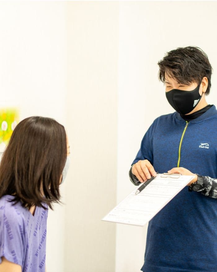 具体的なあなたのお悩みや症状をお伺いします。どんな些細なことでもトレーナーにおっしゃってください。順番になりましたら担当のトレーナーがお呼びいたします。