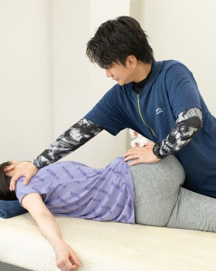 施術エリアにて基本的には施術台の上で施術いたします。筋肉の深層部へアプローチするために皮膚に近い表面の筋肉をほぐしてからお客様のご要望や症状に合わせた施術を行います。